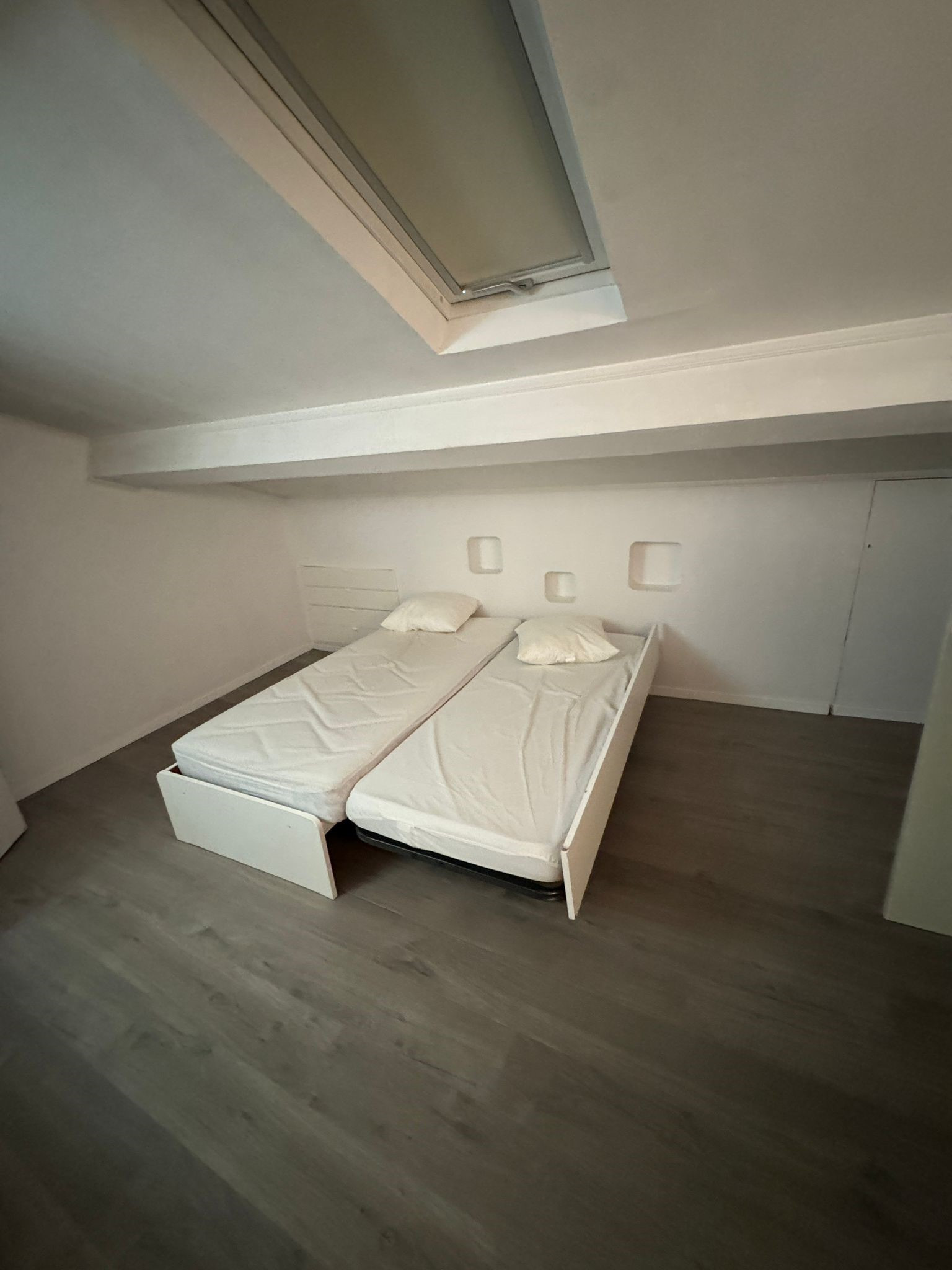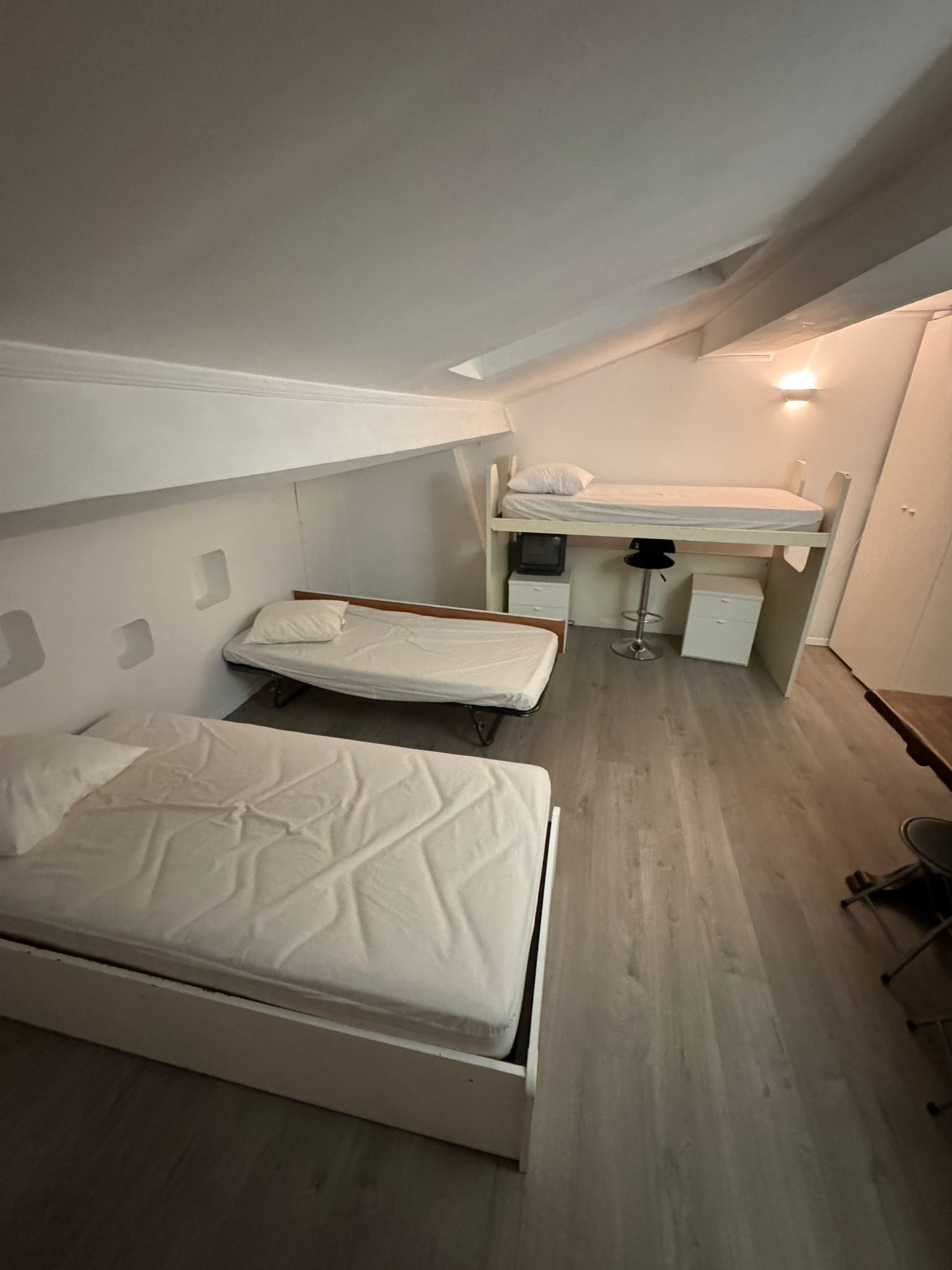 Large living room of approximately 30 m2, with large velux for optimal brightness and 2 windows overlooking the courtyard. Sofa, TV, table and chairs for 6.