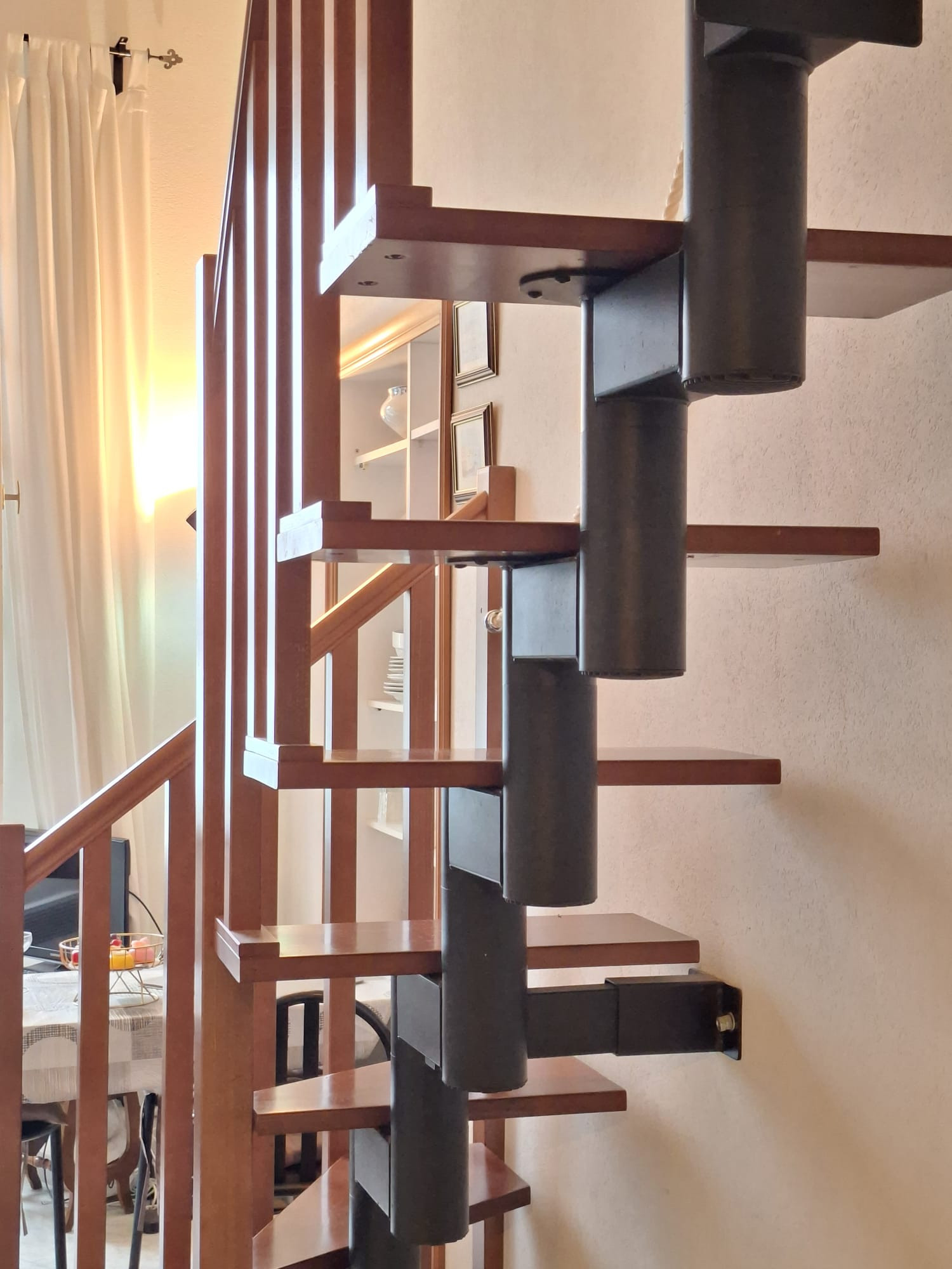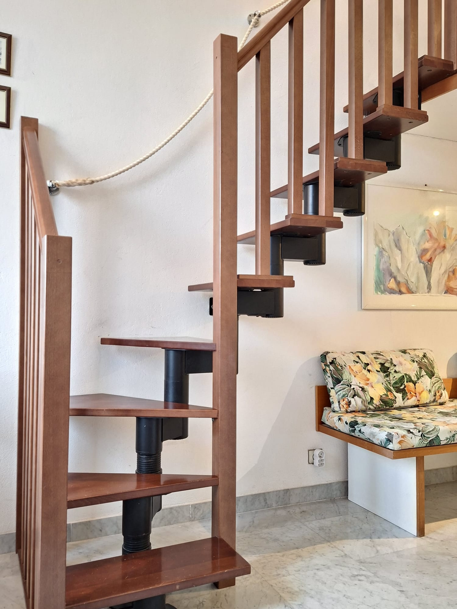 It includes a small equipped kitchen, a sleeping area on the 1st floor with 1 double bed (140 cm), a living room with a dining area and a sofa bed for 2 people, a bathroom with shower and toilet.