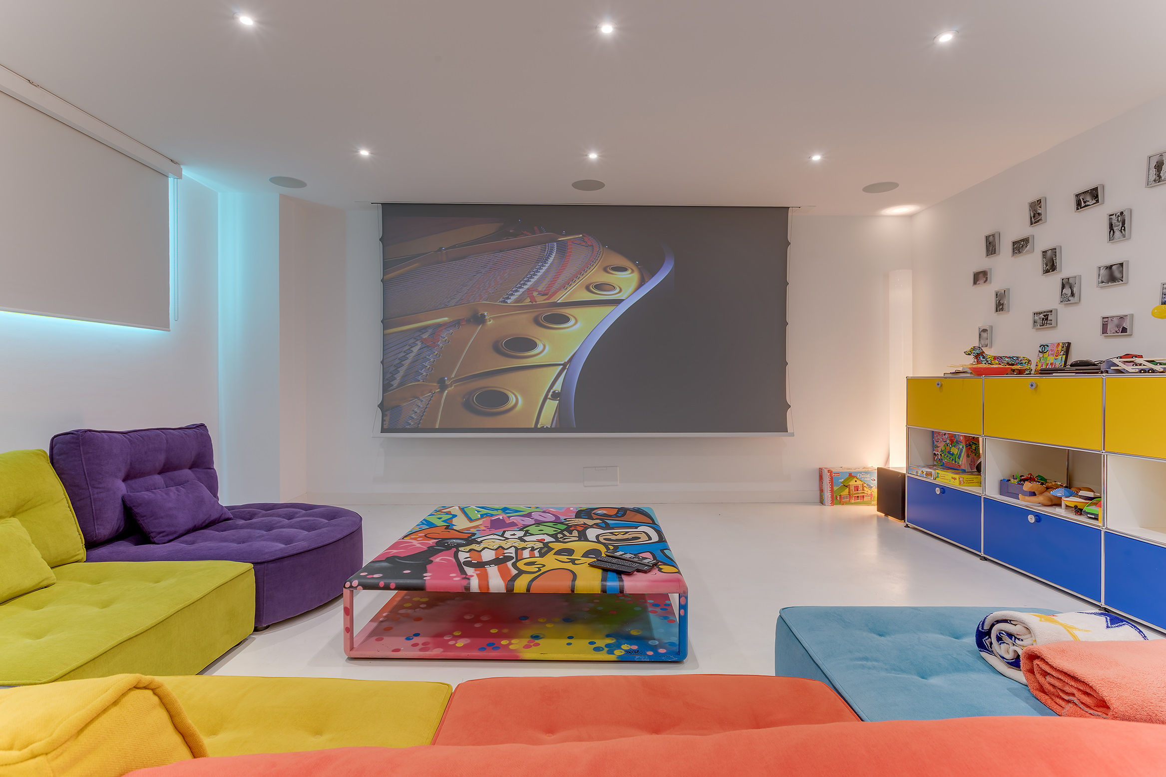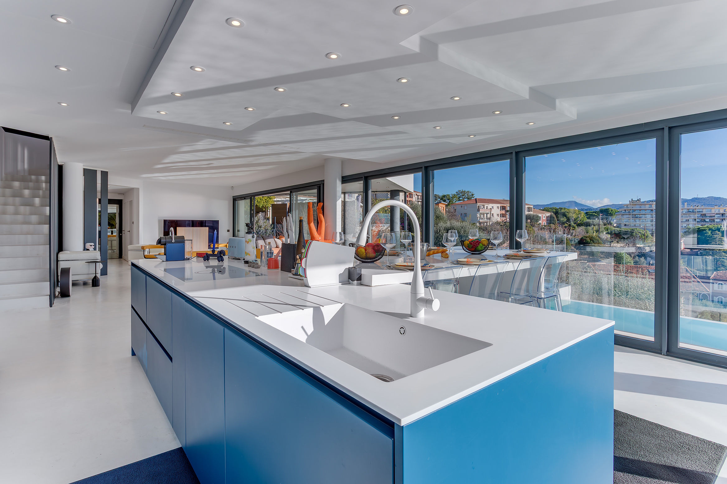 The ground floor space, opening onto the garden and the swimming pool, accommodates a large living room and an open-plan kitchen.