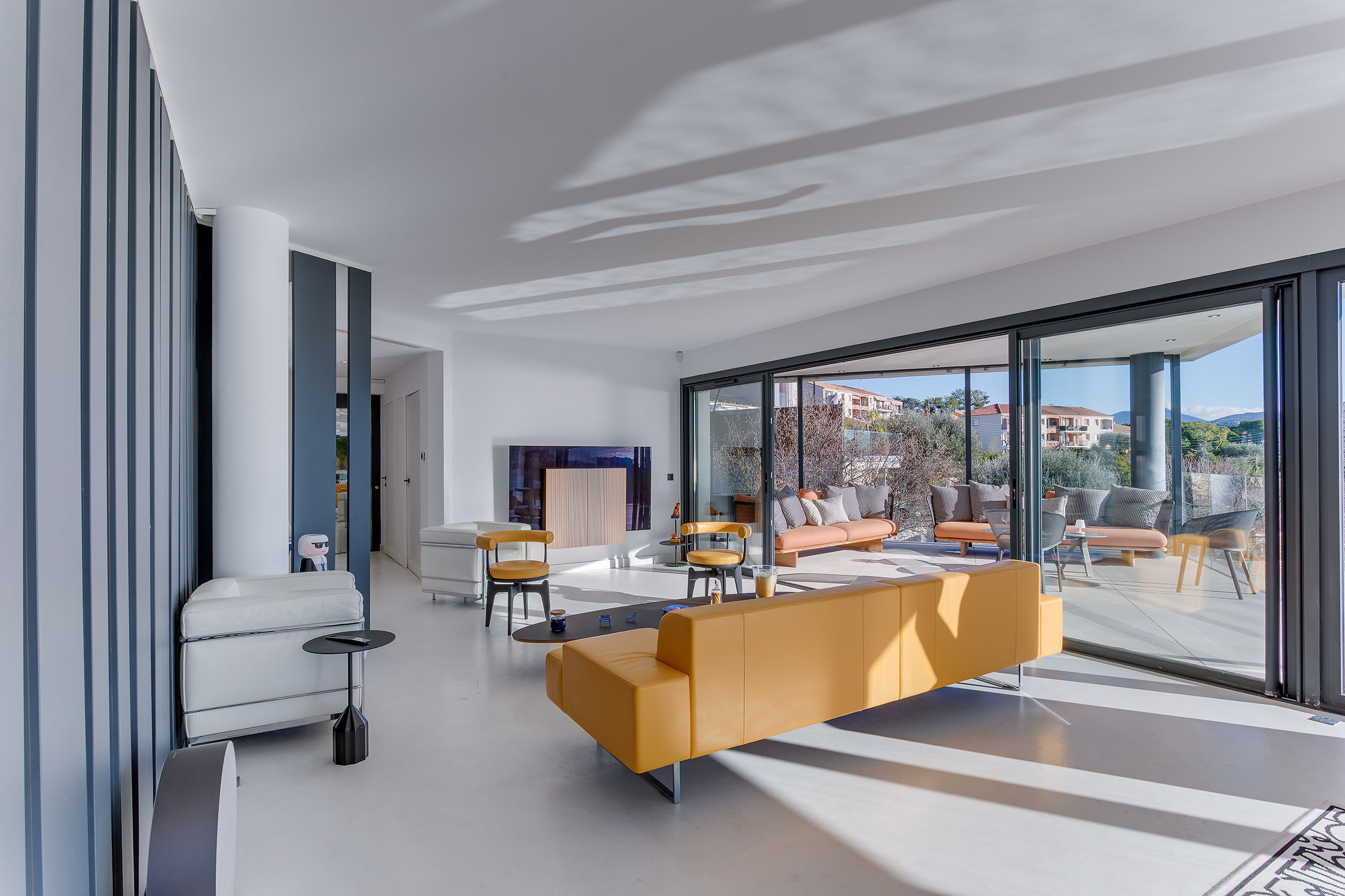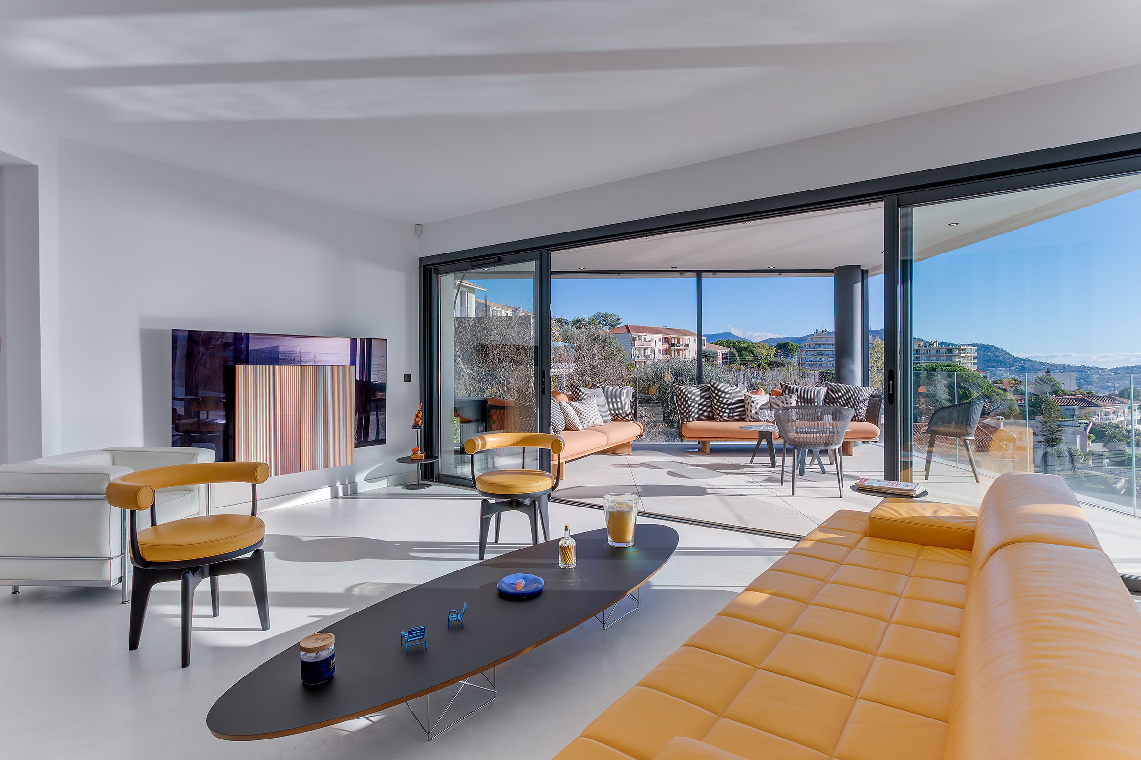 - a bright living room with television and dining area, open to terraces and garden