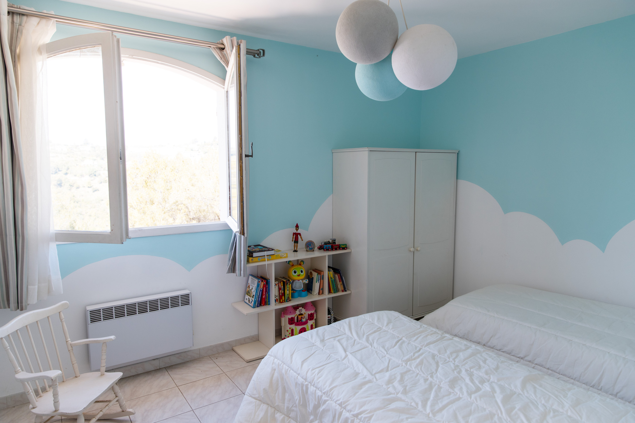 On the first floor there are 3 bedrooms: 1 160cm bed for the master bedroom with an en-suite bathroom (bathtub, sink, toilet),