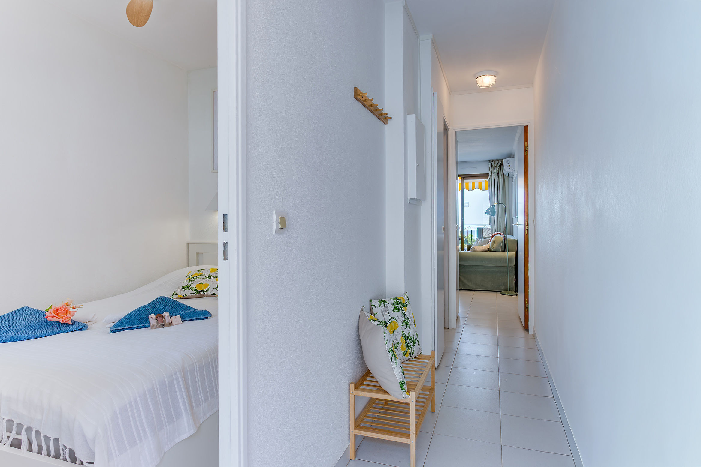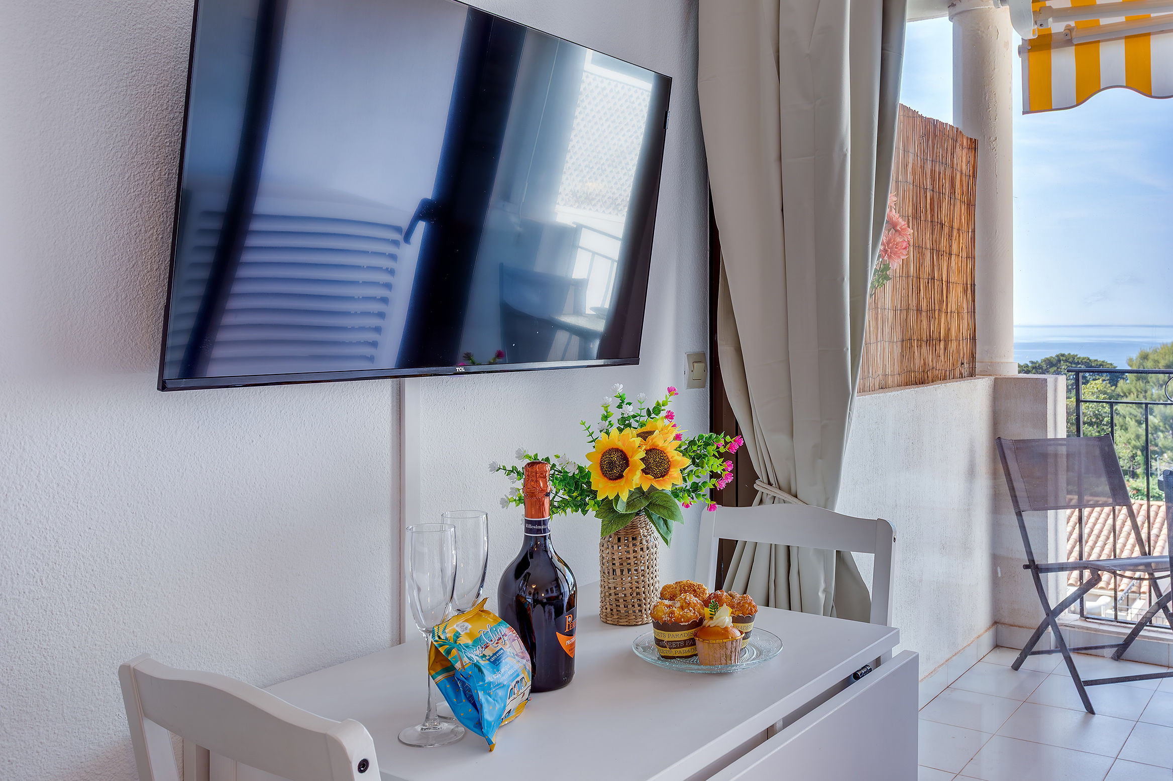 Le logement est composé comme suit : Entrée ouverte sur le salon climatisé comprenant un canapé-lit confortable, des tables basses, une télévision, un système audio et une connexion internet. Le salon offre également une table à manger avec 4 sièges et donne sur la loggia.