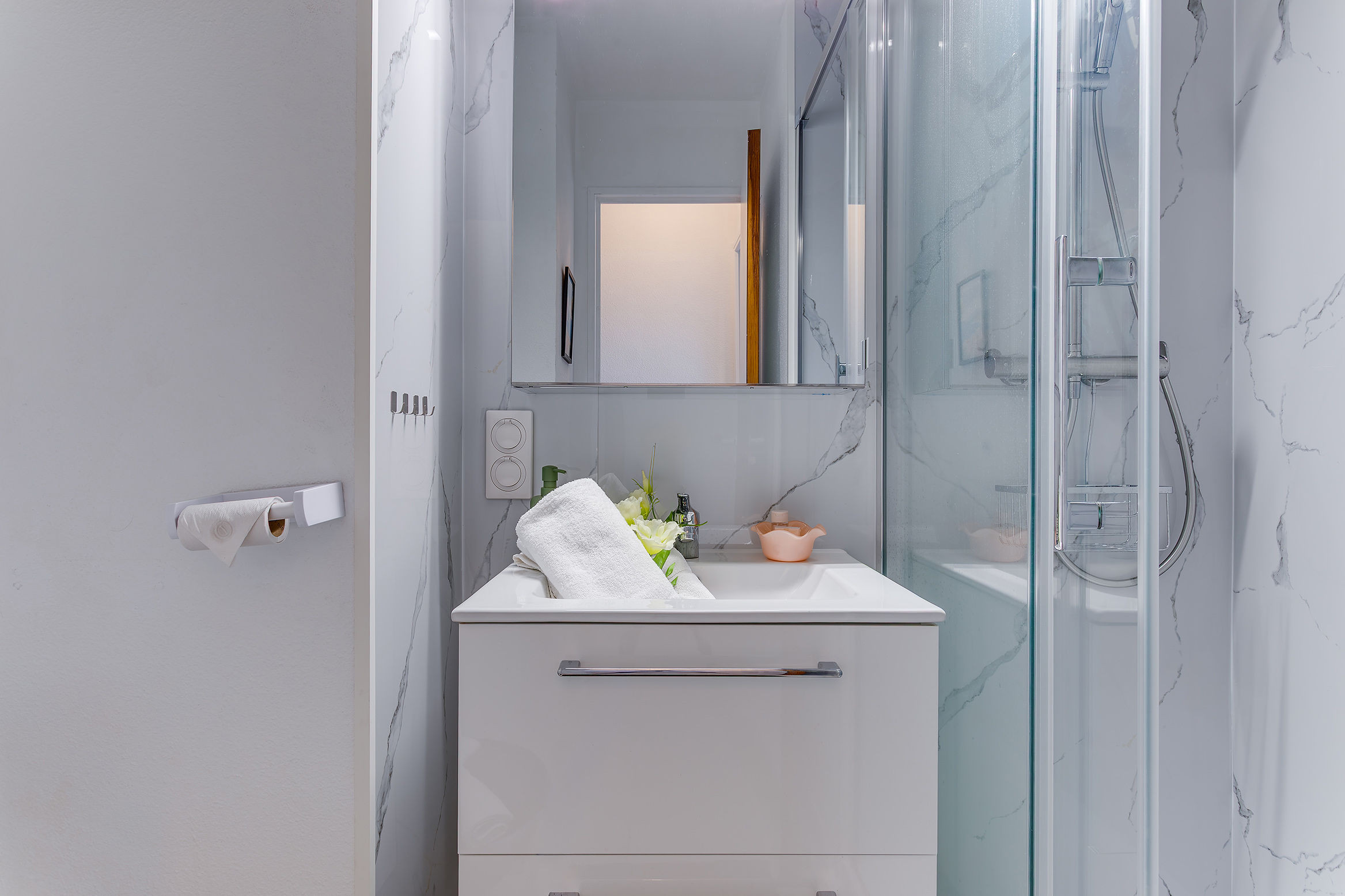 La salle de bain accessible depuis la chambre dispose d'une douche, d'un lavabo et de rangements. Toilettes indépendantes, situées dans l'appartement, sur la loggia (balcon fermé).